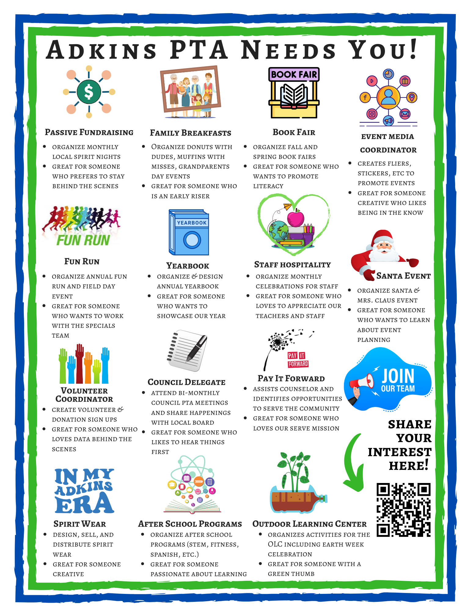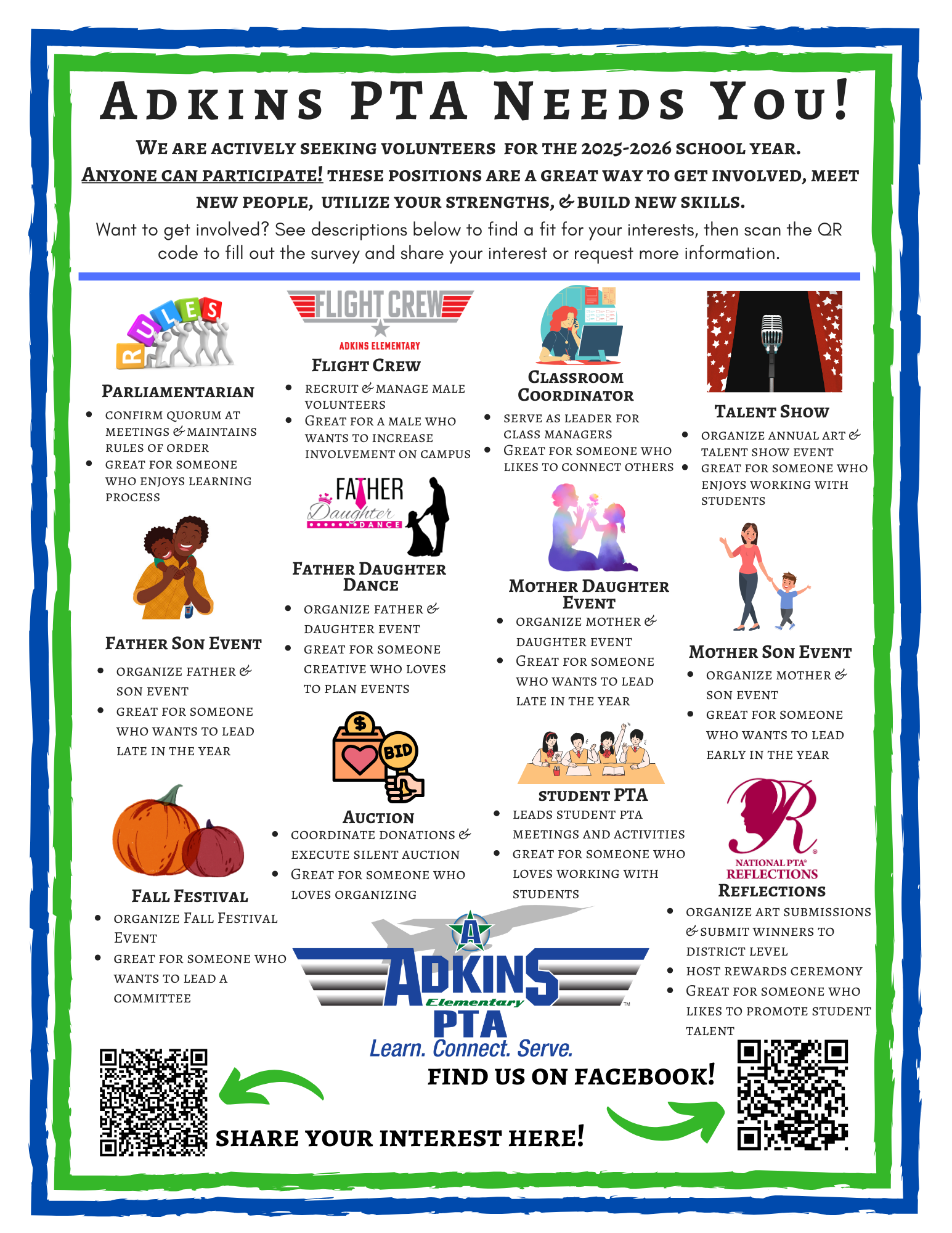 Your membership in our PTA makes everything we do possible! For just $10 annually, you provide a voice to represent a student at Adkins.