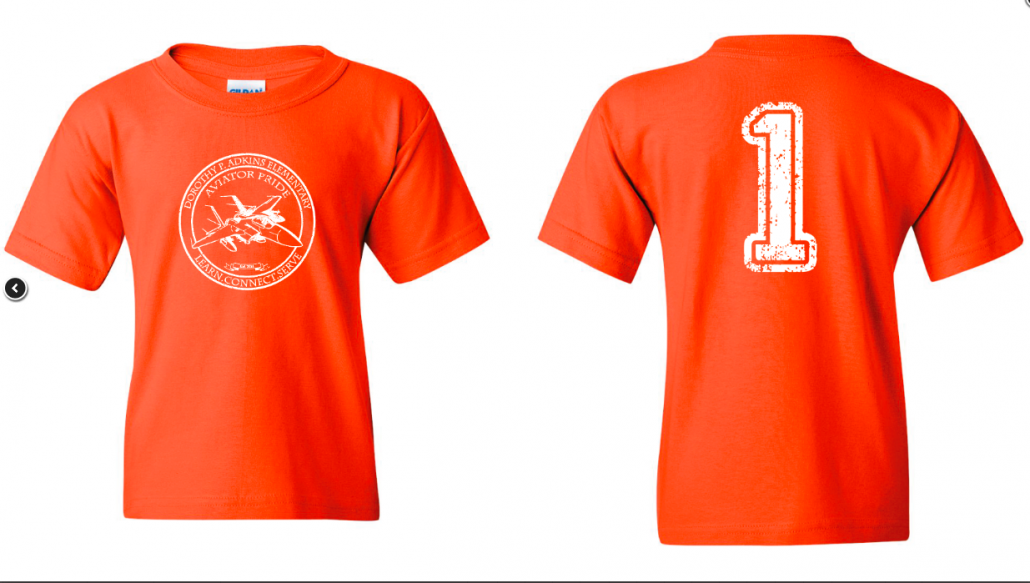 First Grade:  orange tee with “1” on the back and white logo on front