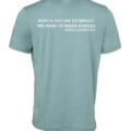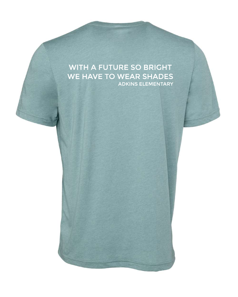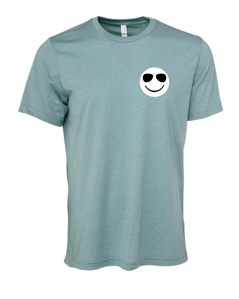 Bella + Canvas CVC Jersey Tee in Heather Blue Lagoon. Smiley Face with Aviators Shades on the front and text “With a future so bright we have to wear shades” and our school name on the back.