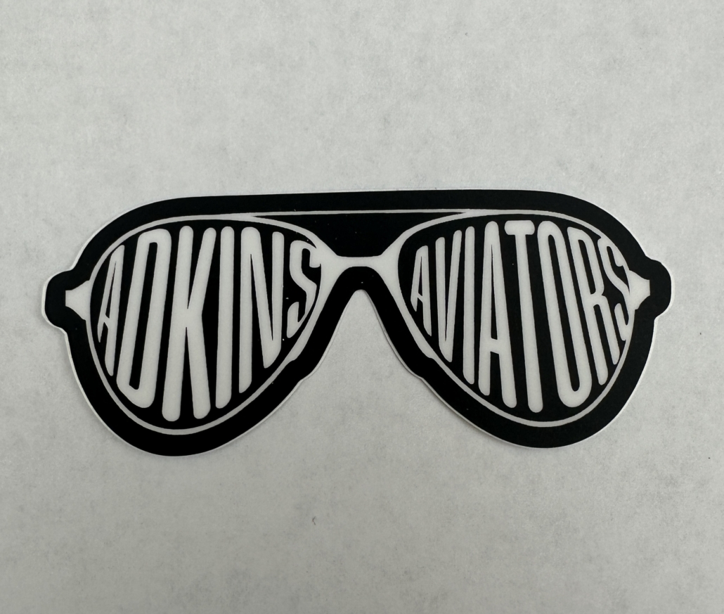 Die-Cut Aviator Sunglasses sticker that says Adkins Aviators in the lenses. Measures 3″ × 1.26″