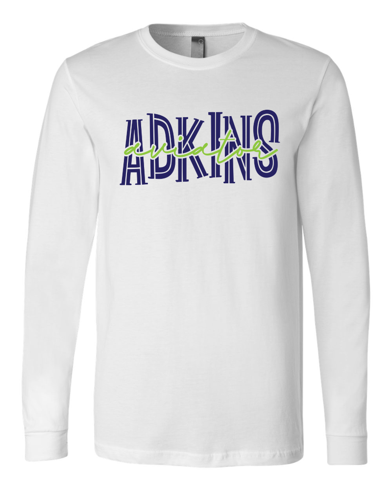 BELLA + CANVAS – Unisex Jersey White Long Sleeve Tee with blue ADKINS and green “aviators”