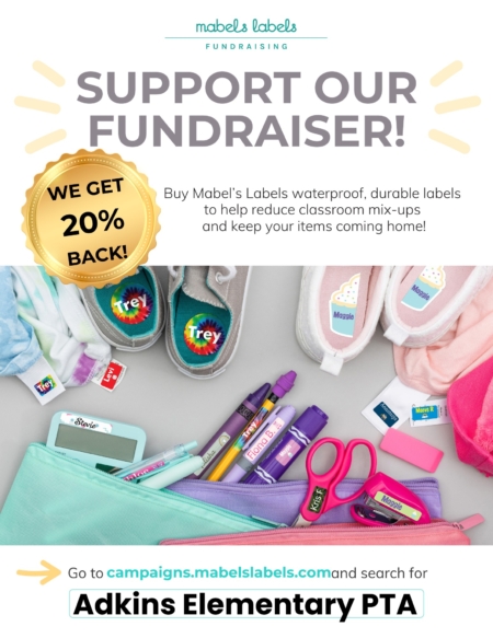 Order now to be ready for school! Go to https://mabelslabels.com/fundraising/support and search for Adkins Elementary PTA to customize your labels today. Thanks for supporting us!