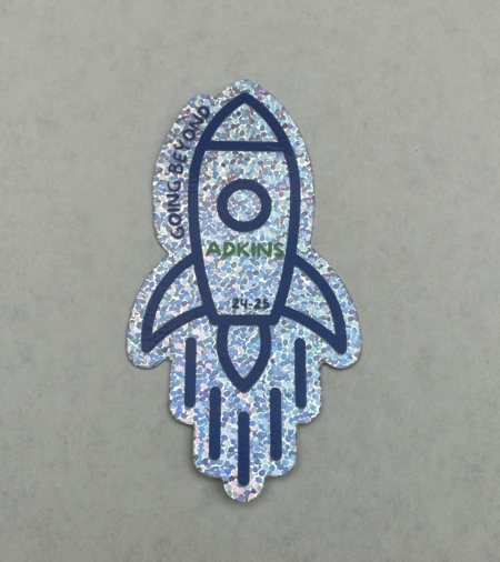 Die-Cut Aviator Glitter Rocket sticker that says Going Beyond to celebrate our theme for the 24-25 school year. Measures 1.61″ × 3″