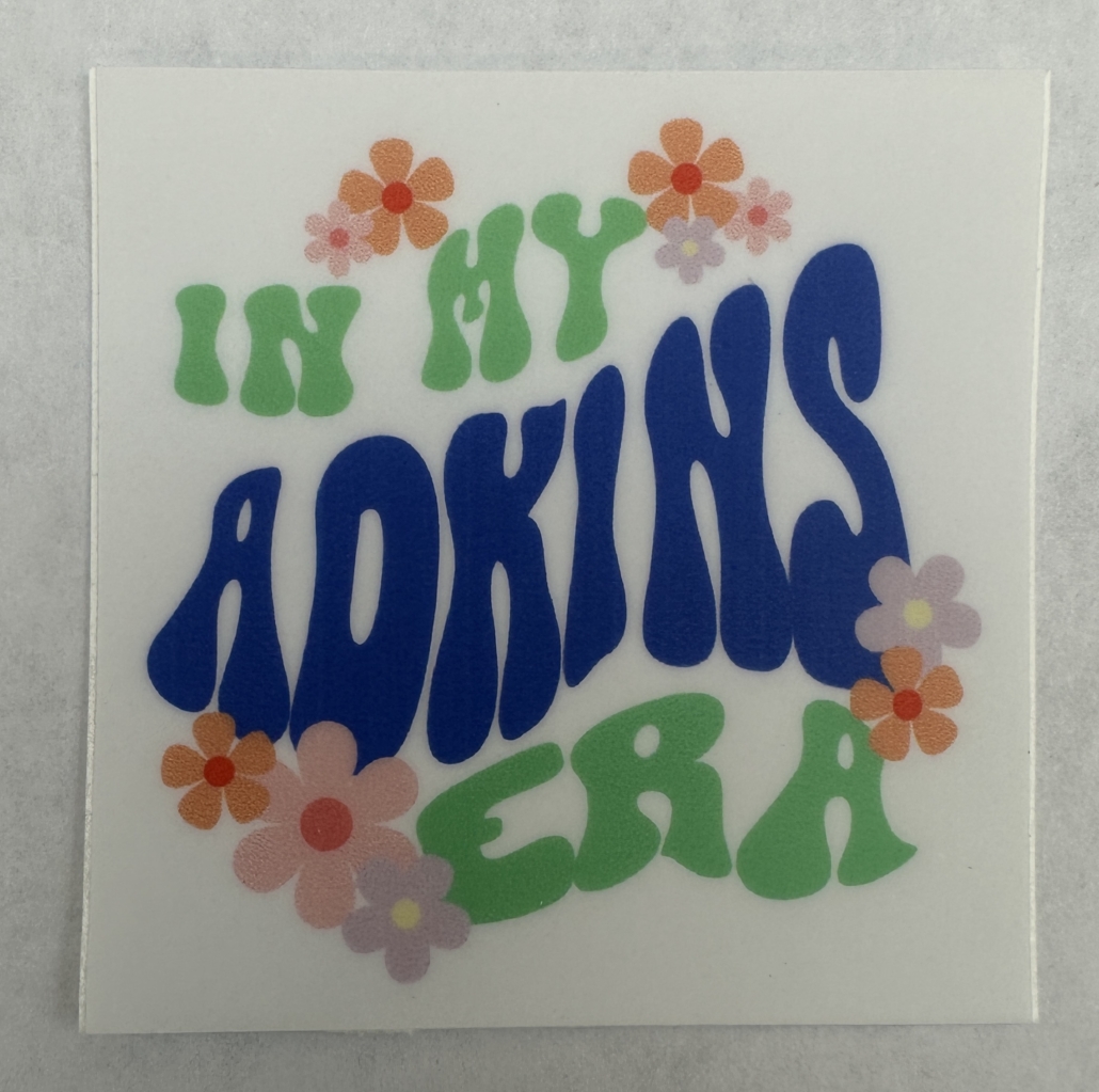 Square white background sticker that says In My Adkins Era. Measures 2″ × 2