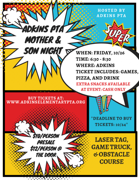 One ticket required per person! Event is open to current Adkins students and their mom (grandmothers and aunts also welcome!). Please purchase one ticket per person. Includes games, pizza, and a drink. Other snacks and drinks available at the event (cash only).