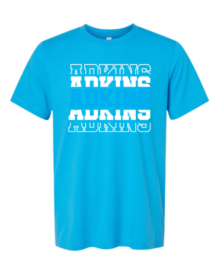 Port & Company tee in Neon Blue with reverb Adkins name